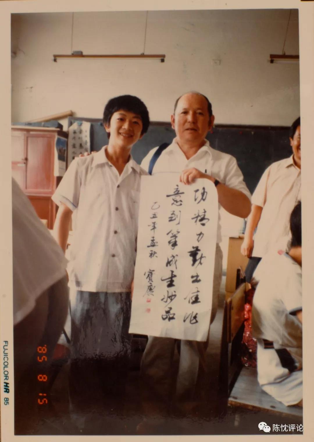 1985年郭宝庆(左)赠送日本早稻田大学友好交流访问团书法作品