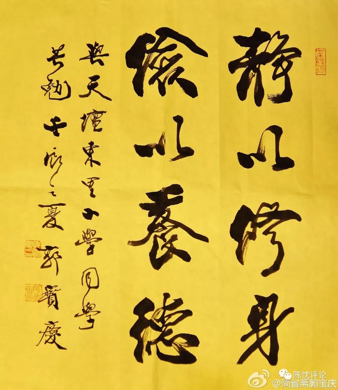 对名利的过度追求,对书画界的有些事情,他有自己的基于“良知”的判断,“有些书画家一见面,就开始滔滔不绝的讲,我最近书法又涨了,多少多少钱一尺”!“我是××多少多少代孙”!每次听到这种话,郭宝庆只是笑着和对方讲“能不能好好聊天?这些和你字写的好与坏有多大关系?来,临一段颜清臣的《多宝塔碑》和《颜勤礼碑》,没学会走,就想跑!”