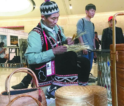 云南澜沧非遗传承人李扎而现场展示竹编技艺。张勇摄/光明图片