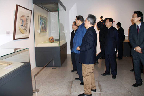王蒙和嘉宾在吉建芳的漫画前-中国国家博物馆-2014年10月