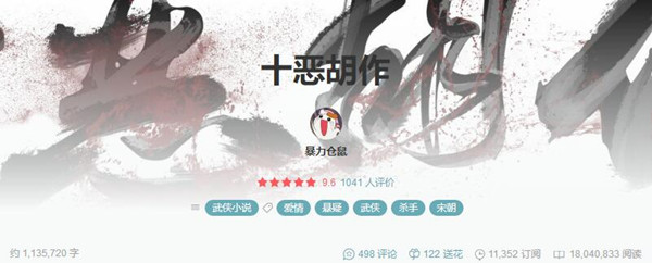 倘若对豆瓣阅读这个写作平台有所了解,都知道它的风格是文艺和清新的,与其它以超长篇连载为特点的网络文学平台比起来,豆瓣阅读上的作品,以几万字的中篇作品为主,并且对文学性的追求较高,可能是所有网络文学平台当中,与传统文学最贴近的。在这样一个小清新的发表平台上,有一部叫做《十恶胡作》的长篇连载武侠小说异军突起,在豆瓣阅读上连载近两年来,点击量已过千万,成了平台上点击量与评分最高的连载作品。