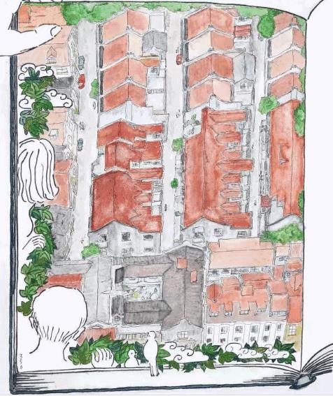 整片城市老街景,被镶嵌在书中,那些上海的红色屋顶是童话的颜色。爷叔想表达什么?左侧翻书的大手和男女后脑勺都没上色啊,下方小鸟尾巴怎么伸出了画面,他解释说,“这是梦中的效果”。