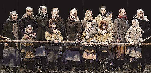 林荫宇:改编作品重要的是看编导者用什么样的叙述策略和舞台语汇来完成文本的转换。我从列夫·朵金执导的《兄弟姐妹》中就看到了导演驾驭原著的能力和水准。《兄弟姐妹》改编自前苏联作家阿勃拉莫夫的长篇小说《普利亚斯林一家》三部曲,自1985年首演以来,常演不衰30余年。舞台呈现上,列夫·朵金一方面通过精彩的舞台调度和场面展现人们的生存状态和思想情感,另一方面以陌生化手法,对人们生活中司空见惯的事物进行了间离,从而产生了震撼与感动。比如,剧中,男主人公米哈伊尔从前线回来了,母亲和弟弟妹妹们围在身边,他分发礼物:鞋、布、子弹壳,最后他托着一个布包说,这是最意外的礼物。家人们期待着,观众期待着……他一层一层地打开覆盖的布,露出了一整块黑面包!舞台上所有的人屏气凝神地注视着这块面包,那么神圣那么专注那么虔敬地凝望着它,一个长长的静场。这时,五六岁的小妹妹轻声地问:“妈妈,这是什么?”母亲表现出一种难以言说的难过:一个以面包与马铃薯为主食的民族,竟然不知道面包的模样。小女儿呀,你长这么大,还没见过它,不认识它!导演用这样一个细微的场面拨动了观众的心弦,仿佛一丝苦汁浸透心脾。