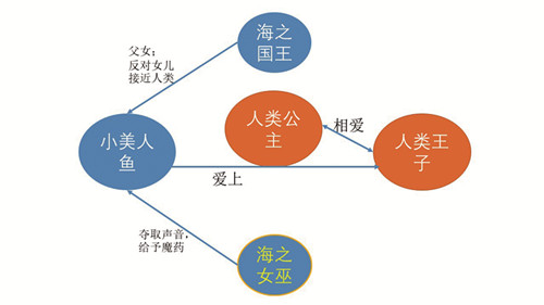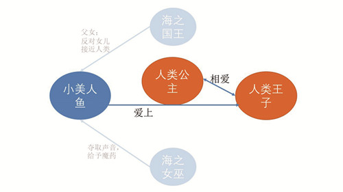 这个著名的爱情故事曾被捷克斯洛伐克、保加利亚、日本等国改编为电影和动画作品。美国迪士尼公司也在1989年拍摄了动画电影版的《小美人鱼》。“小美人鱼失去了爱情和生命,不过在300年后,她将获得一个不灭的灵魂。”——为了削弱原作故事中的悲剧色彩以适合孩子们观看,迪士尼版本的故事在保持原作基本情节的基础上,做了极大程度的改编。下面两图表示的是原著中的人物关系: