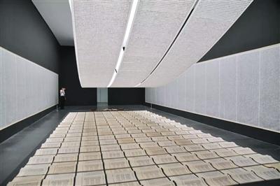 《天书》是一套艺术装置,它由上百册古书、悬挂的古代经卷式卷轴和两侧墙壁上放大的书页构成,书页和卷轴上印着4000多个徐冰制造的“伪汉字”。这些文字没有任何意义,就连徐冰自己也无法释读。