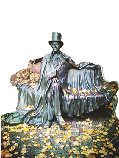 我住的安徒生丽笙酒店,门口有棵高大的银杏,座椅绕树围成半圆,安徒生坐像占了三分之一。安徒生肩头的大披风右边拖地,左边遮盖了椅子足有两人的位置,脚边的地下放着手提包。秋深了,金黄的杏叶散落一地,有些落在了安徒生的披风上。