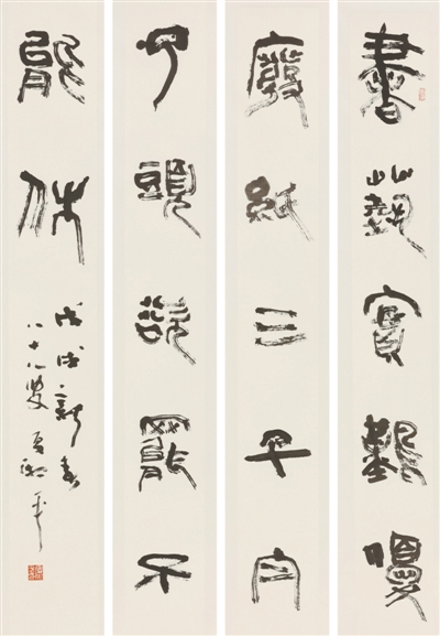对于如何看待书法传统这一问题,夏湘平认为,最重要的是消化传统,领悟它外露的、内涵的精神气质,心领神契,作为自己艺术思想的支柱。善于从传世佳作中披沙拣金,从传统中继续探索拓路前行,才有可能自出机杼。在当今书坛,面对古代丰富的书法遗存,有人因循守旧、畏缩不前;有人独辟蹊径,凭借智慧和才情在他人熟视无睹或无能为力的碑帖上发现新的闪光点,寻找新的突破口,从而完成创变。毫无疑问,夏湘平属于后者。数十年来,他坚守着汉碑这块阵地,以极其敏锐的思维从万千习书人熟识的《石门颂》中解读他人难以窥得的信息。《石门颂》用笔劲健苍古、方折露骨、奔放纵逸等特征,结字势态高古、篆隶并用、重心多变等特点均被夏湘平一一识出并撷取精华。然而,他并未就此止步。长期以来,夏湘平坚持广涉博取、兼收并蓄的师法理念,《张迁碑》《礼器碑》《曹全碑》《鲜于璜碑》等都在其涉猎的范围内,篆书、楷书、行书、草书亦均在其研习之列。尤为可贵的是,夏湘平对优秀传统和古法经典的研究至今也不曾懈怠,其书在“由法到意”和“由意到法”的循环往复中不断迈向新的高地。