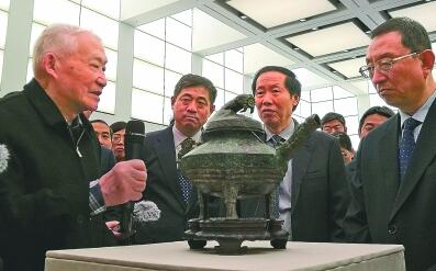 孙机(左一)向雒树刚(右一)、刘玉珠(右二)介绍“虎瑩”的情况。本报记者 李韵摄/光明图片