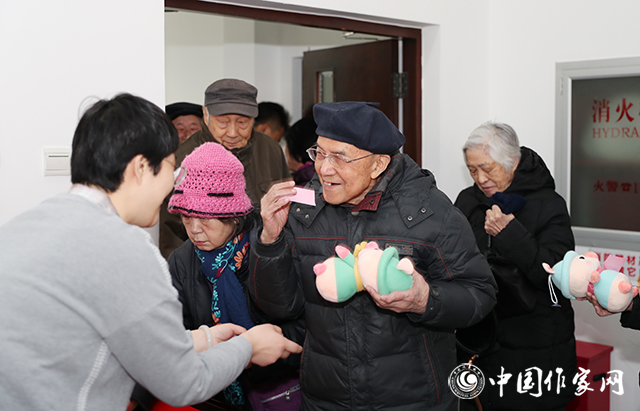 前来参加联谊会的老同志们签到,工作人员向老同志赠送新春吉祥物