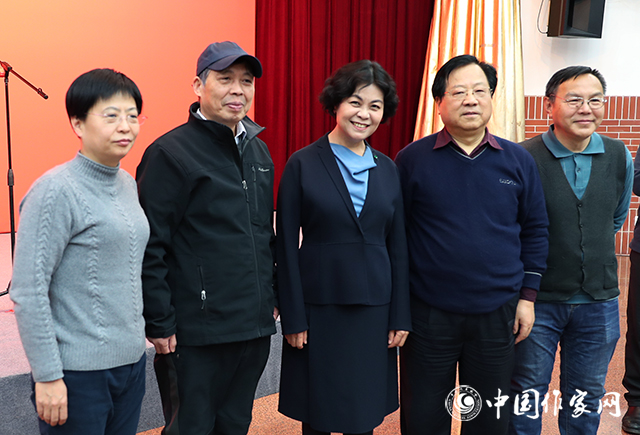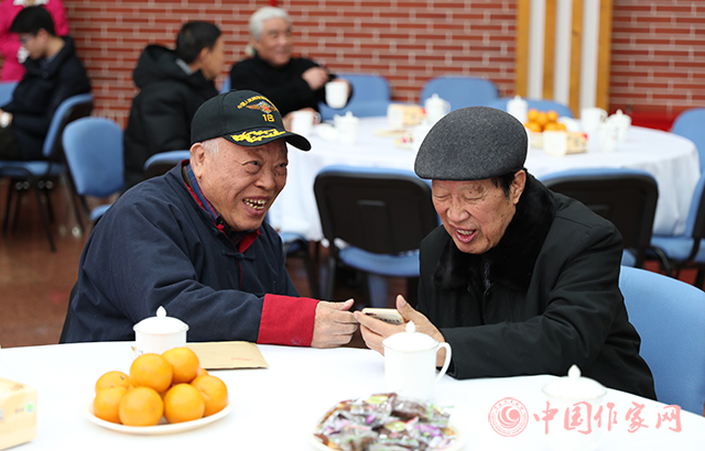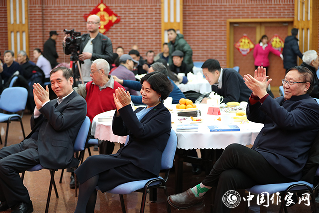 中国现代文学馆多功能厅张灯结彩,暖意融融,红色背景板上“讴歌新时代 攀登新高峰”的大字分外醒目。一阵阵欢声笑语,一声声祝福问候,传递着节日的喜庆气氛。