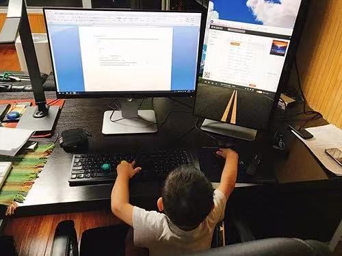 吕铮的儿子挠挠在吕铮写作桌前“指点江山”