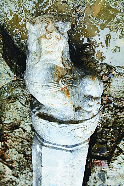 黄泗浦遗址宋代河道底部石栏杆上的石狮。