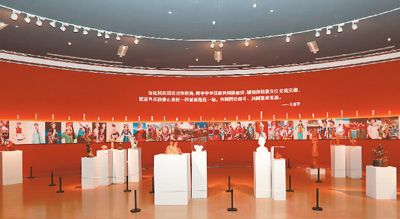 步入中国美术馆一层正中圆厅,其展陈既有多民族的题材,也有各民族独立、鲜活、个体的风采,作品以错落有致的雕塑形态凝聚在一起,互动在一起,犹如石榴籽一样点缀在圆厅里,融汇在大家庭中,形成多样统一的设计场域,有机彰显了民族大团结的展览主题。圆厅半圆形背景墙上,突出呈现了56个民族身着不同服饰的照片。照片墙正中,是习近平总书记在中共十九大报告中的讲话。当观众站在半圆的圆心观赏展览,满眼皆是民族风采的同心圆,每张笑脸都似花在盛开。在展陈灯光设计上,使用主体灯、射灯、背景灯,以及凹凸呈现法,营造出绚丽繁盛、流光溢彩的视觉效果,有力烘托了民族团结的主题。