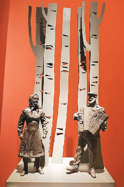 本次展览展示了许多优秀作品。譬如《民族大团结》浮雕,就是一件非常重要的作品。这是1951年由徐悲鸿先生的高足、留法雕塑家王临乙创作的浮雕,当时是用汉白玉做的,捐献给中国美术馆的是石膏的。这次,中国美术馆把石膏浮雕翻成青铜浮雕,使观众可以更好地领会其独特形式与恢弘气势。这件作品中,前排的人们正在演奏芦笙、手鼓与唢呐等乐器,后排的各族妇女身着盛装、翩翩起舞,展现出国家统一、民族团结的美好景象。这件作品堪称民族大团结题材雕塑创作的重要源头,因此,此次展览将这件作品陈设于中国美术馆一层正中圆厅的重要位置,吸引了大量观众驻足观赏。