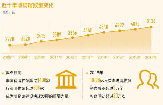 据文化和旅游部统计,2008年至今,我国博物馆的数量呈现明显加速增长之势。截至2017年底,全国在各级政府备案的博物馆达到了5136家,每年新增博物馆平均在180家左右。