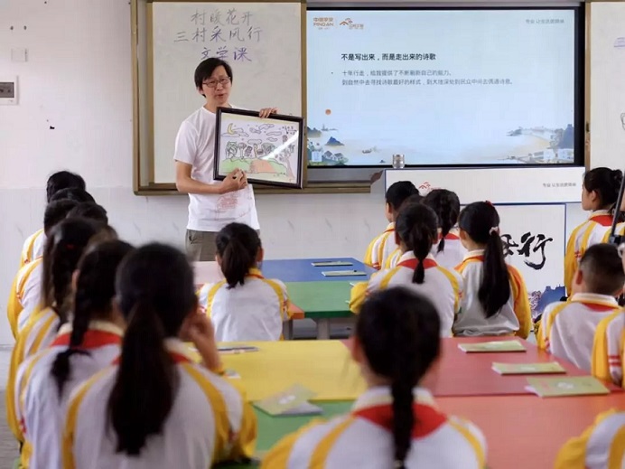 李元胜在课堂上传授孩子“如何从生活中找到灵感,开出诗歌之花”的技巧