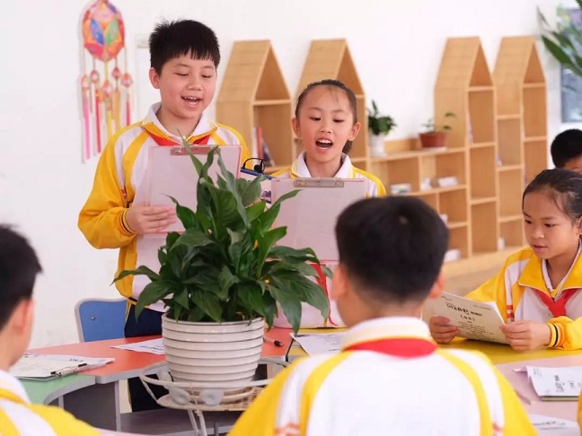 来自靖西第三小学的何瑞翔、钟瑾涵两位同学,率先朗诵了一首《春天的脚印》