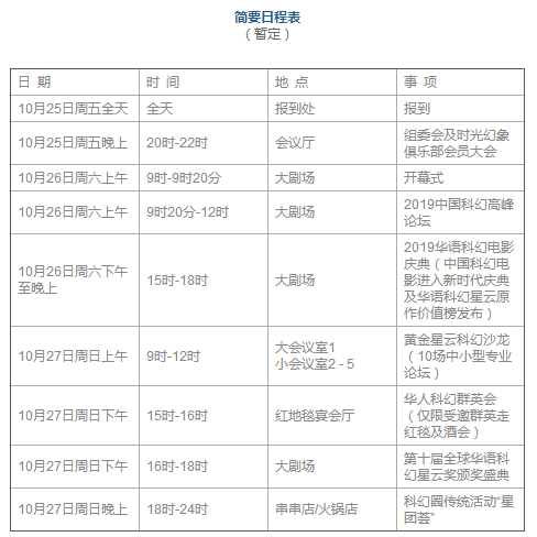 经过组织委员会及运营委员会的努力,由新华网、壹天文化和时光幻象(世界华人科幻协会实体支撑单位)主办的第十届全球华语科幻星云奖嘉年华暨2019华语科幻电影庆典准备就绪,决定于2019年10月25日至27日在中国重庆举行第十届全球华语科幻星云奖颁奖盛典、华人科幻群英会、2019中国科幻高峰论坛和2019华语科幻电影庆典(中国科幻电影进入新时代庆典及华语科幻星云原作价值榜发布)等系列活动。目前,已有208位嘉宾确认参会,组委会将在9月以前,向受邀者发出参会通知。