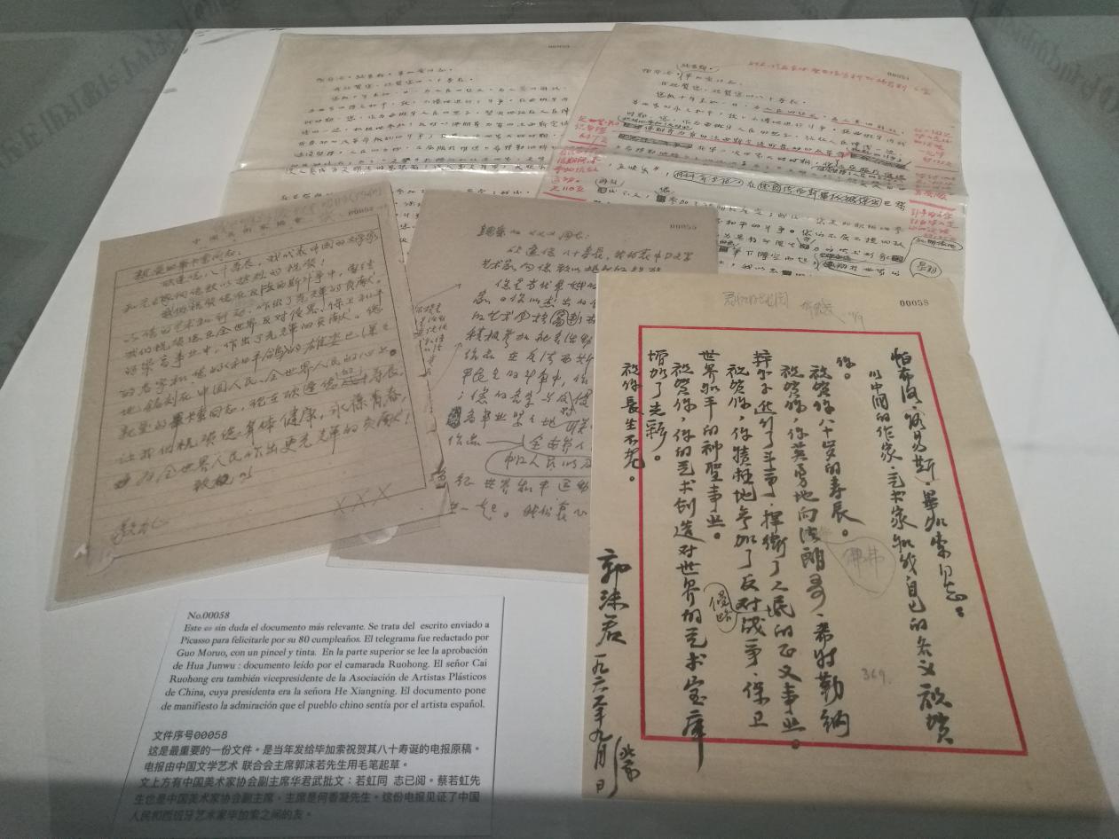 展览中还有一件特殊的未曾发表过的展品: 诗人郭沫若在1961年代表中国政府为祝贺毕加索80寿辰而起草的贺电手稿原件。这份手稿表现出了中国对这位马拉加天才的与尊重,同时也见证了中国人民和毕加索之间的友谊。手稿原件由收藏家李志远提供,除原稿之外,还包括定稿之前数个版本的修改稿。毕加索与中国之间的吸引是双向的。这位安达卢西亚画家深深被中国书法的抽象意境、自由笔触和简洁之美所吸引,沉醉在纸与墨的诗意对话中,他为此对克劳德·罗伊说出了那句著名的话:“如果我出生在中国,我就不会成为画家而是书法家了,我会写我的画。”毕加索在1956年曾见过画家张仃,十年后又在法国戛纳见到张大千,他曾多次对他们表明自己是中国艺术表现力和包容性的崇拜者。