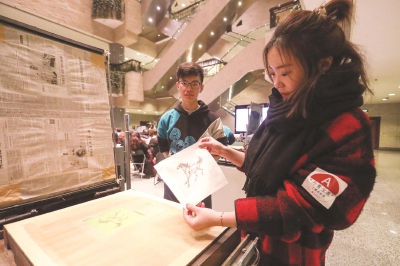 “丹青宝筏”2019上博奇妙夜活动上,观众在展示自己制作的书画复制品。本报记者叶辰亮摄