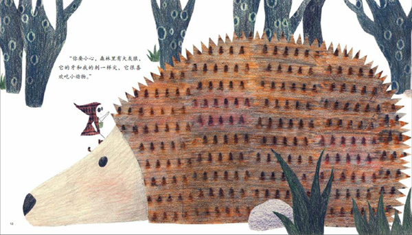 韩煦:您的问题很细致。在拼贴拓印技法的基础上,我会针对自己的每件作品寻找最合适的表达方式。《走出森林的小红帽》用到许多粗头的彩铅,拓印出来的肌理会有颗粒感,而《章鱼先生卖雨伞》用的都是细头彩铅,相对柔和一些。除此之外,两个作品的拓印还有一点区别,《小红帽》里的一些形象的颜色是有过渡的,比如刺猬,我用了深棕浅棕两种颜色,而《章鱼先生》里的所有图形元素都是平涂。这些手法上的调整都是与作品的内容、设定的目标读者群和我想传达的情绪有关。