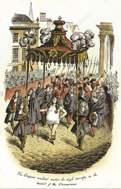 英国画家惠斯勒(Reginald John“Rex”Whistler,1905-1944)为这篇童话所作的插图,原载于1935年在伦敦出版的一部安徒生童话选的英文本,图下的英语写的是“皇帝在华盖下走在游行队伍之中”。惠斯勒出生于大伦敦地区东南部一位建筑师的家庭。他十四岁就读于一家寄宿学校,开始显示出艺术才能,毕业后他被皇家艺术学院录取,可是在那儿觉得格格不入,未久就改投同属一流艺术院校的伦敦大学学院附属的斯莱德艺术学院,在那儿如鱼得水,此后他作为职业艺术家的生涯也是一路顺风,并且成为社交界的名流。他替伦敦西区的剧院做艺术设计,为出版商作文学作品插图(其中包括《格列佛游记》和伊弗林·沃的小说),甚至还为芭蕾舞剧设计布景和服装。作为画家,他以壁画、立体感强烈而逼真的所谓“错视画”以及肖像画蜚声于世。第二次世界大战爆发后,年届卅五的惠斯勒投笔从戎,在英国装甲兵部队服役,官拜少尉。1944年七月,他指挥驾驶的坦克车队在诺曼底与德军遭遇,他不幸壮烈牺牲。据说当时在《泰晤士报》收到的读者悼亡信件当中,惠斯勒在所有的英军阵亡将士中名列第一。安徒生童话的原文里,有四处文字明确提到,皇帝身无寸缕,可是惠斯勒跟安徒生本人特别喜欢的丹麦插图家彼得森一样,趣味较为保守,在图中让皇帝得以穿着内衣遮丑。
