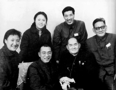 20世纪70年代末,陈景润(前排左二)、徐迟(前排左三)与本文作者周明(后排右一)、作家秦牧(前排右一)、黄宗英(前排左一)等合影