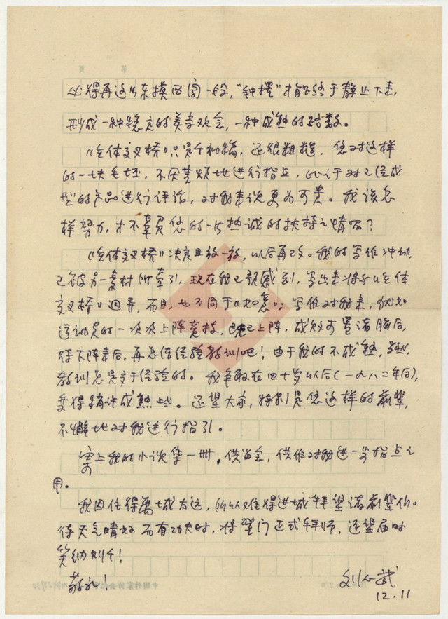 12月8日的来信收到了,您在百忙中第二次极恳挚地对《立体交叉桥》一稿进行指点,使我非常感动!您并对《如意》进行了发自内心的鼓励,也使我增加了写作上的信心。
