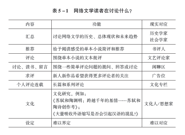 表5-1网络文学读者在讨论什么?