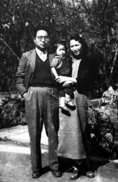 1945年,靳以与妻女在北碚夏坝复旦新村