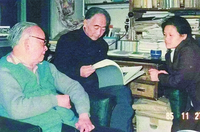 1985年11月作家彭荆风摄于沈从文家中,从左至右:沈从文、汪曾祺、彭荆风的女儿彭鸽子