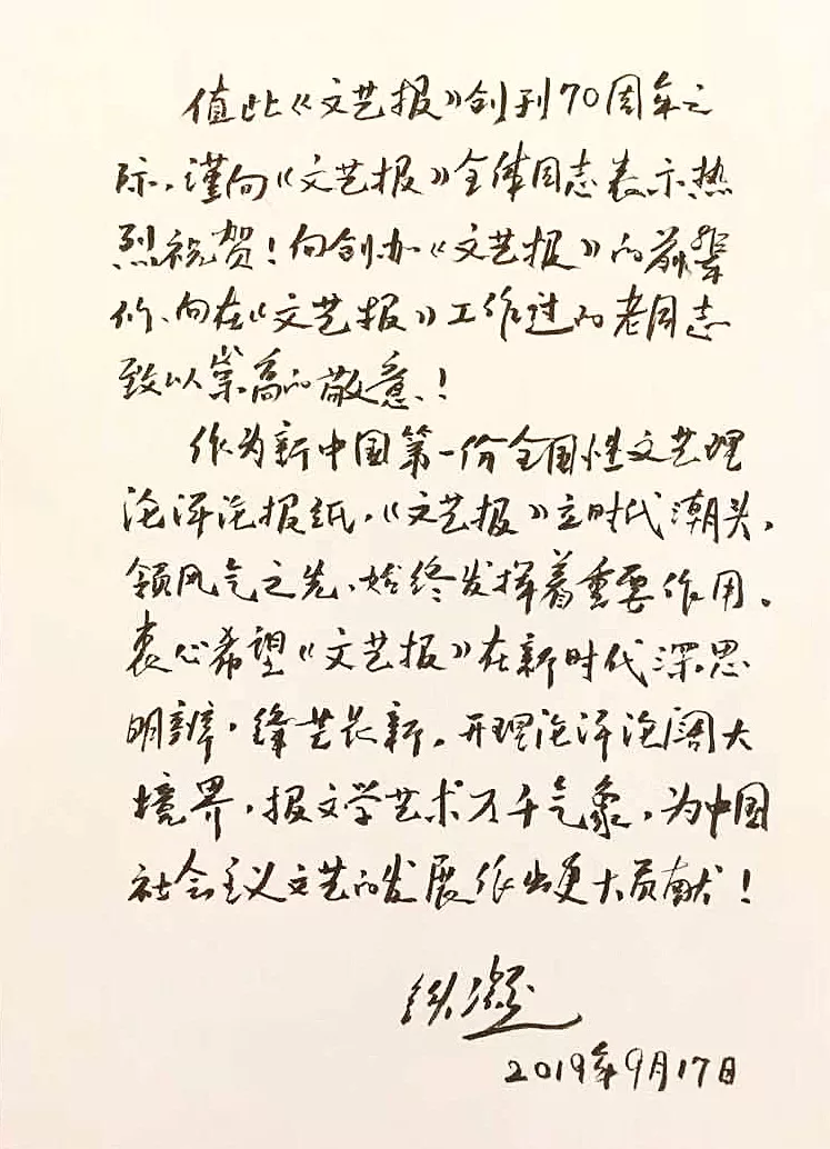 值此《文艺报》创刊70周年之际,谨向《文艺报》全体同志表示热烈祝贺!向创办《文艺报》的前辈们、向在《文艺报》工作过的老同志致以崇高的敬意!