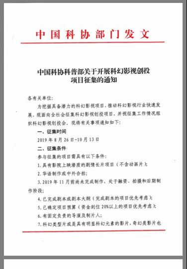 为了繁荣科幻影视创作、挖掘孵化具有市场潜力的科幻影视项目,2019中国科幻大会还特别设置科幻电影创投环节,由中国科协科普部于8月28日正式公布了《关于开展科幻影视创投项目征集通知》。