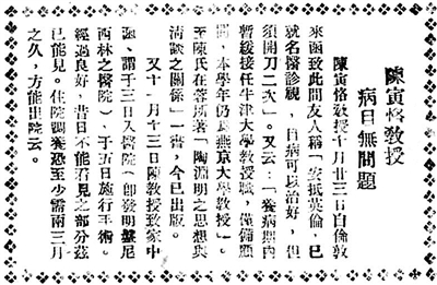 又十一月十三日陈教授致家中函,谓于三日入医院(即发明盘尼西林之医院),于五日施行手术。经过良好,昔日不能见之部分兹已能见。住院调养恐至少至两三月之久,方能出院云。