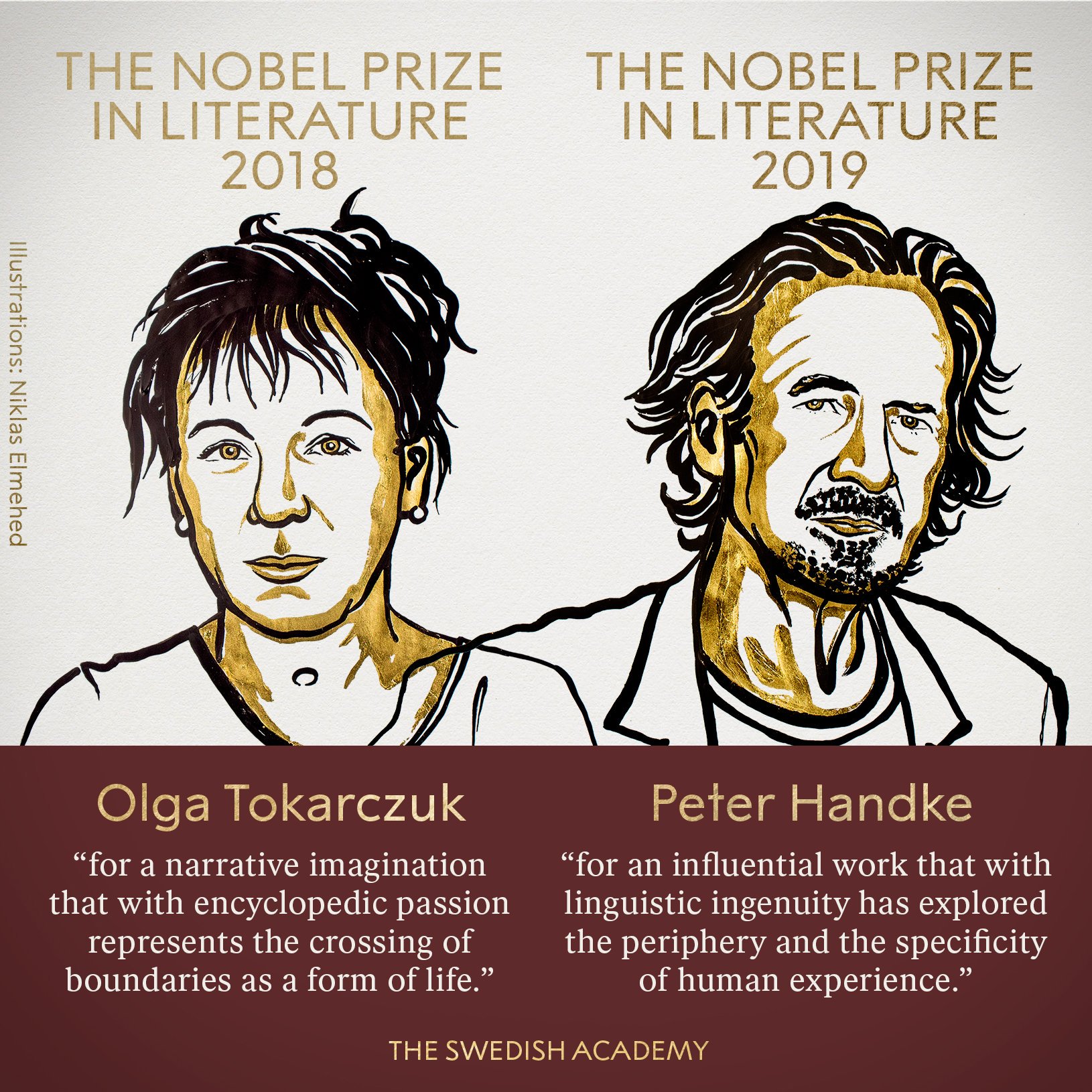 当地时间10月10日,瑞典文学院宣布,将2018年诺贝尔文学奖授予奥尔加·托卡尔丘克(Olga Tokarczuk),将2019年诺贝尔文学奖授予彼得·汉德克(Peter Handke)。