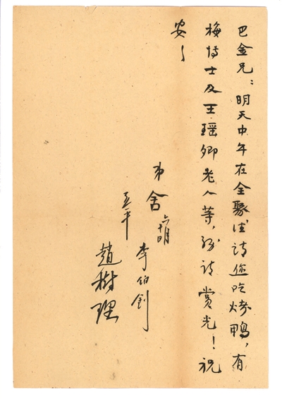 这次展览中,有两张老舍邀请巴金吃饭的便条,写于1950年代初。一张是老舍、王亚平、李伯钊、赵树理等几位北京市文联的负责人联署的:“明天中午在全聚德请您吃烤鸭,有梅博士及王瑶卿老人等,务请赏光!”这算正式宴请。另外一张是巴金说的“吃小馆”:“会后我预备上琉璃厂,您愿同去否?若同去,咱们可顺手吃小馆。”当时的东安市场(后改名东风市场)、琉璃厂都是巴金等文人流连之地,约三五好友在那里买书、买文具或其他的小东西,留下了很多难忘的记忆。