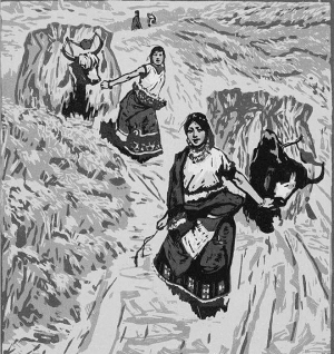 版画家李焕民于1959年创作的套色木刻版画《初踏黄金路》,反映了西藏和平解放以后废除农奴制,藏族群众翻身做主的新生活。在画中,3位藏族女子各自牵着一头牦牛走在金黄色的庄稼路上。这幅作品用高明度高亮度的红、黄为主基调来烘托画面喜庆丰收的气氛,显得璀璨夺目。作者采用肯定、简练的刀法,并注重刀法的写意性表现,与画面中欢快的人物形象形成呼应,使作品在视觉上呈现出和谐的节奏感和韵律感。这幅作品既具有强烈的时代特色,又具有极高的审美价值。