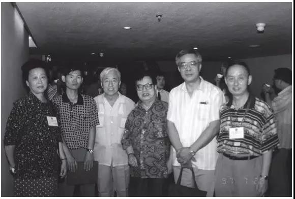 图2 1997年,作者张静(左一)参加北京世界科幻大会,和郑文光(右三)、刘兴诗(右一)等合影