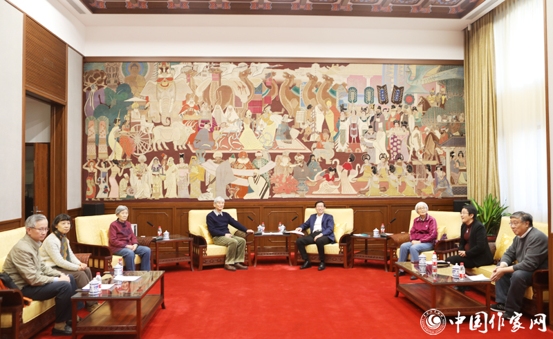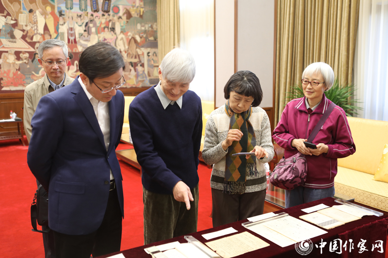 国家图书馆馆长饶权(左二)与杨晦先生子女共同观看杨晦先生手稿等珍贵文献