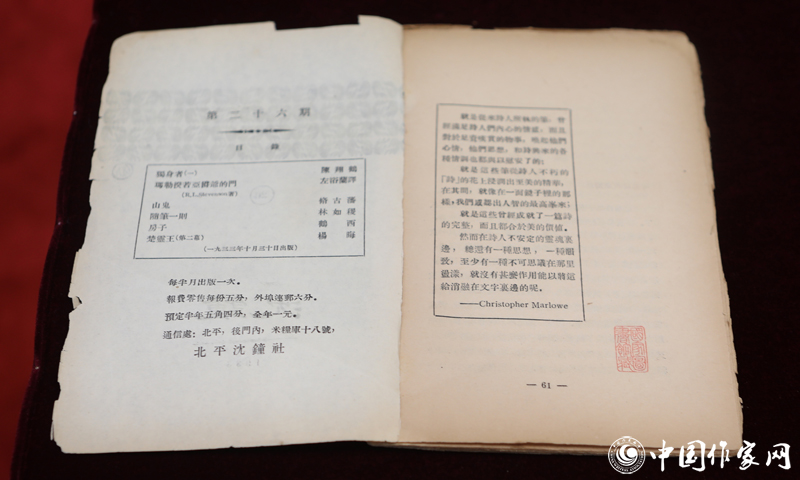 从这段引文中,大致可见沉钟社“将真和美歌唱给寂寞的人们”的追求,以及该社幽婉抒情的文学特征。此期杂志1933年10月30日出版,刊载了杨晦的剧本《楚灵王》(第二幕)。