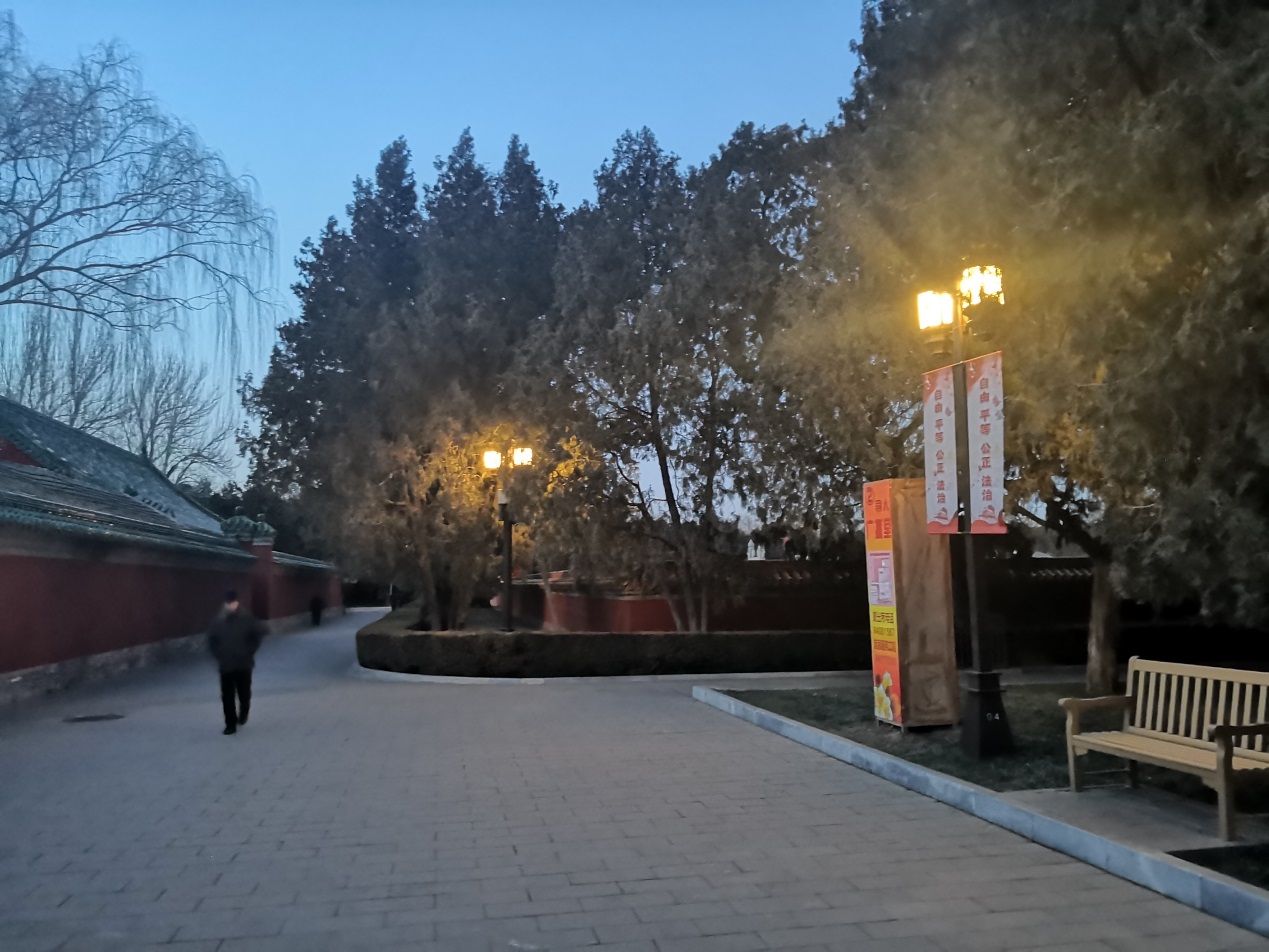 听完朗诵会,我突然意识到自己从未去过地坛,看天色还早,便搭车前去。地坛公园面积不大,用脚步衡量很快就会走完,但在松柏常翠的安静里用心体会,又觉得忽然间进入了一个无垠的空间。离开时明月已上树梢,看着门外的车水马龙和门内逡巡的小鸟,真切地感受到史铁生先生所说,“在人口密集的城市里,有这样一个宁静的去处,像是上帝的苦心安排。” (上图即2020年1月4日傍晚的地坛公园。 陈泽宇 摄)