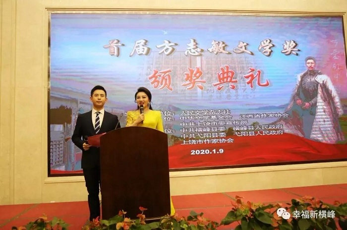 1月9日,由《人民文学》杂志社作为学术指导单位,中华文学基金会、江西省作家协会、中共上饶市委宣传部主办,上饶市横峰县、弋阳县以及上饶市作家协会承办的首届方志敏文学奖颁奖典礼在南昌前湖酒店举行。方志敏烈士之女方梅等方志敏亲属及其生前战友子女代表,《人民文学》主编施战军,江西省委宣传部副部长黎隆武,上饶市委常委、宣传部部长丁晓胜,横峰县委书记饶清华,弋阳县委书记谢柏清等领导出席颁奖典礼。江西省、市、县相关部门负责人及中央、省、市、县媒体记者,红色文学爱好者,共计200余人参加颁奖典礼。