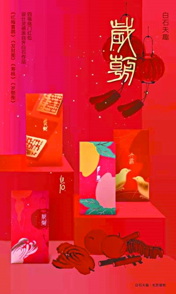 春节文化年货与延续了数千年的节日一样,离不开传承,历代名人书画也是绝佳素材。北京画院就以齐白石先生的多幅作品为灵感,设计了几款红包:大喜红包,取材齐白石一幅梅花图上的喜鹊,红包的名字也来自这幅画的题款:大喜;发财红包上的一只小算盘,源自齐白石的《发财图》;岁朝红包的灵感则源自齐白石的《岁朝图》。每款红包上都印有齐白石原作简介,便于人们了解相关文化信息,而直接取材于齐白石书法的福字,更是在上个月拿到广州艺博院售卖时遭遇卖断货。