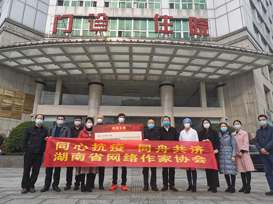 病毒无情,人间有爱。新冠疫情发生后,省网络作家协会成员自发捐款12万余元。2月底,省网络作家协会发出爱心募捐活动倡议书,协会成员积极响应,再次踊跃捐款,短短一星期共募集爱心捐款62840元,为打赢抗疫战展现了网络作家的担当和力量。这批新募集的爱心款项全部捐赠长沙市第一医院,用于支援新冠病毒防疫工作。省网络作协常务副主席、网络作家妖夜(黄雄),省网络作协副主席兼秘书长杨国炜,网络作家流浪的军刀(周健良)、邓谦,省委统战部民主党派工作处、新的社会阶层人士工作处、以及长沙市第一医院有关负责人参加捐赠仪式。