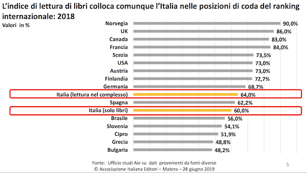 2019年,意大利出版商协会成立150周年。7月28日,协会主席Ricardo Franco Levi发表讲话,题为“意大利出版社现状、读者情况、销售情况以及新的电子化领域”(若无特别指出,以下数据皆来自于该文件)。讲话的开头便援引了经济合作与开发组织的2015年PISA项目数据。