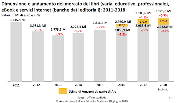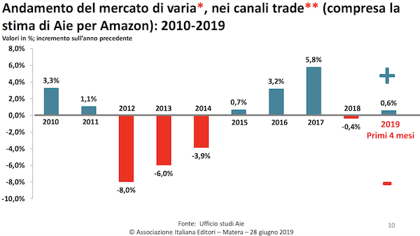 就图书市场而言,除去教材等专业型书籍,意大利出版商协会给出了2010年至2019年十年间的销量数据,同时算上了估算的亚马逊数据: