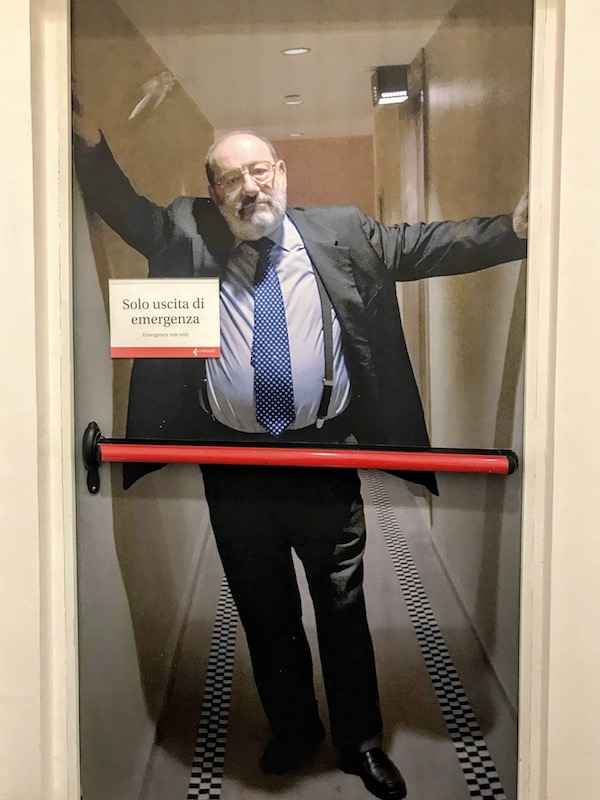 佩鲁贾的la Feltrinelli书店中一景:紧急出口上贴着翁贝托·埃科的巨像,并写着:“只有紧急情况才能离开”,似乎暗指:若无急事(哪怕疫情来临?),请勿离开阅读的世界。? 周之桓
