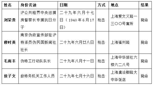 此外,《忠义救国军志》也记载了抗战爆发前后,军统“总指挥部”、各区(站)、各“行动队”等各个单位锄奸行动的具体信息——包括汉奸姓名、身份劣迹,行动的单位、日期、手段、地点和结果等。其中有张金宝所在的军统“上海直属行动队”狙杀刘荣贵、穆时英、毛雨丰、侯子文等记载,相关情况见下表。