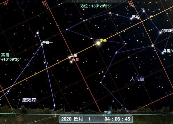 2020年4月1日凌晨4:06北京地区东南方的星空模拟。图片来源:Redshift Pro截图