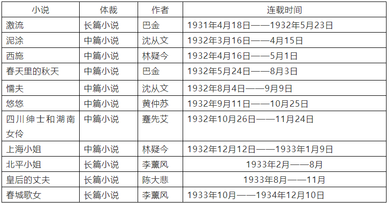 这一切对于报馆而言又意味着什么?以下根据笔者整理的1931年4月——1934年12月《时报》连载小说情况表,尝试对《激流》连载结束后,《时报》报馆怎样调整连载小说这一问题作具体分析: